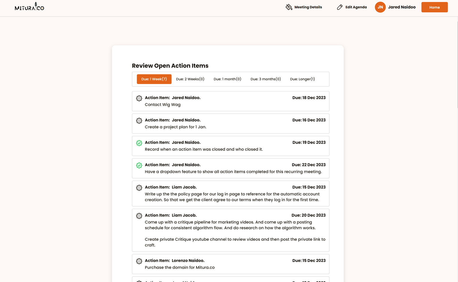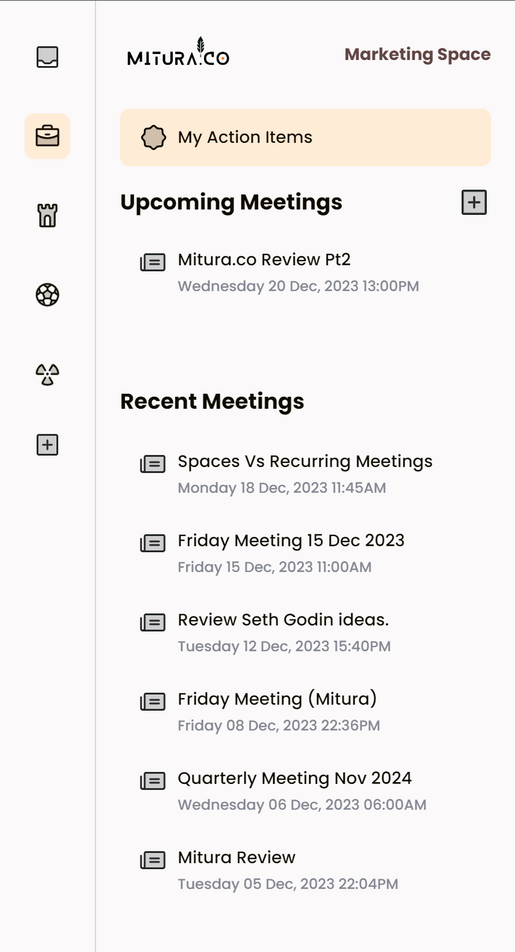 Check all open tasks before each meeting using our Action Items feature. It's the easy way to make sure nothing gets missed, keeping your team organized and on track."