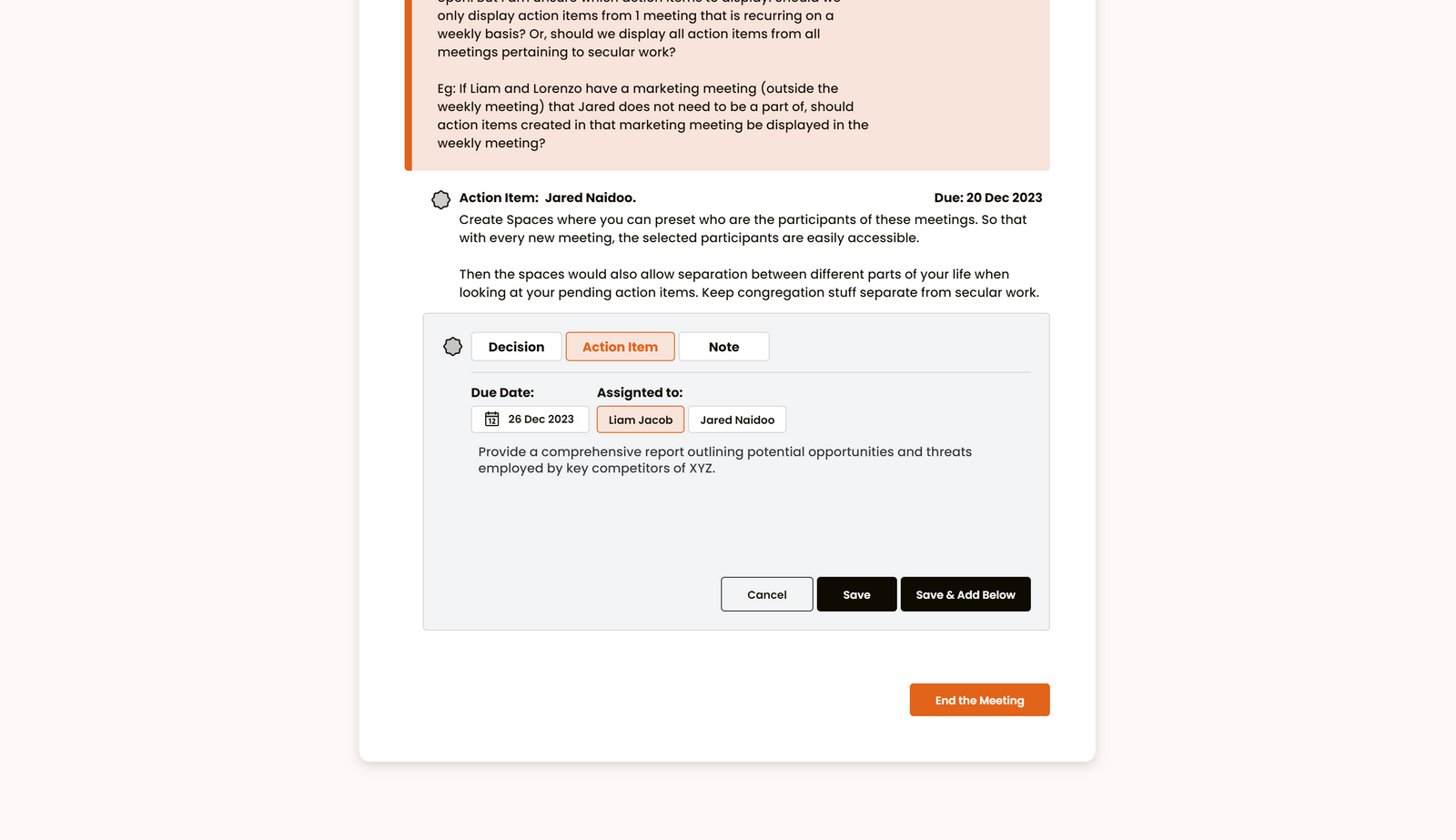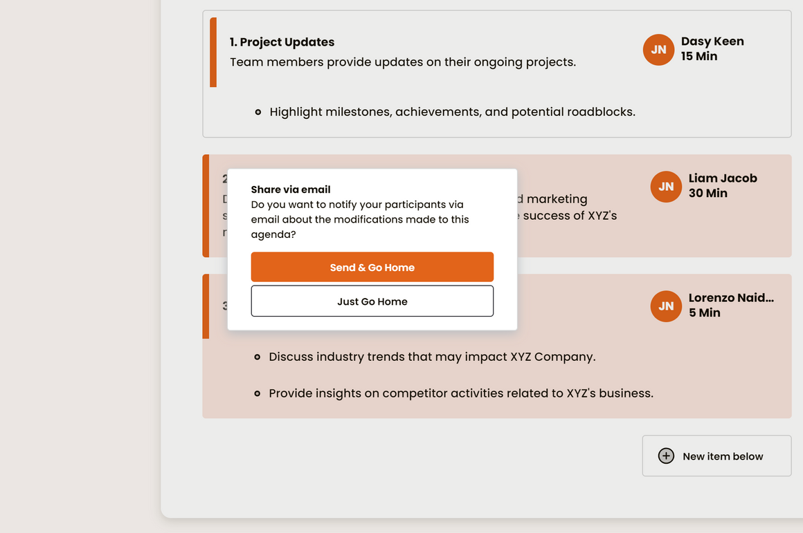 Stay on top of tasks with Action Items. Easily assign responsibilities to team members and set due dates.